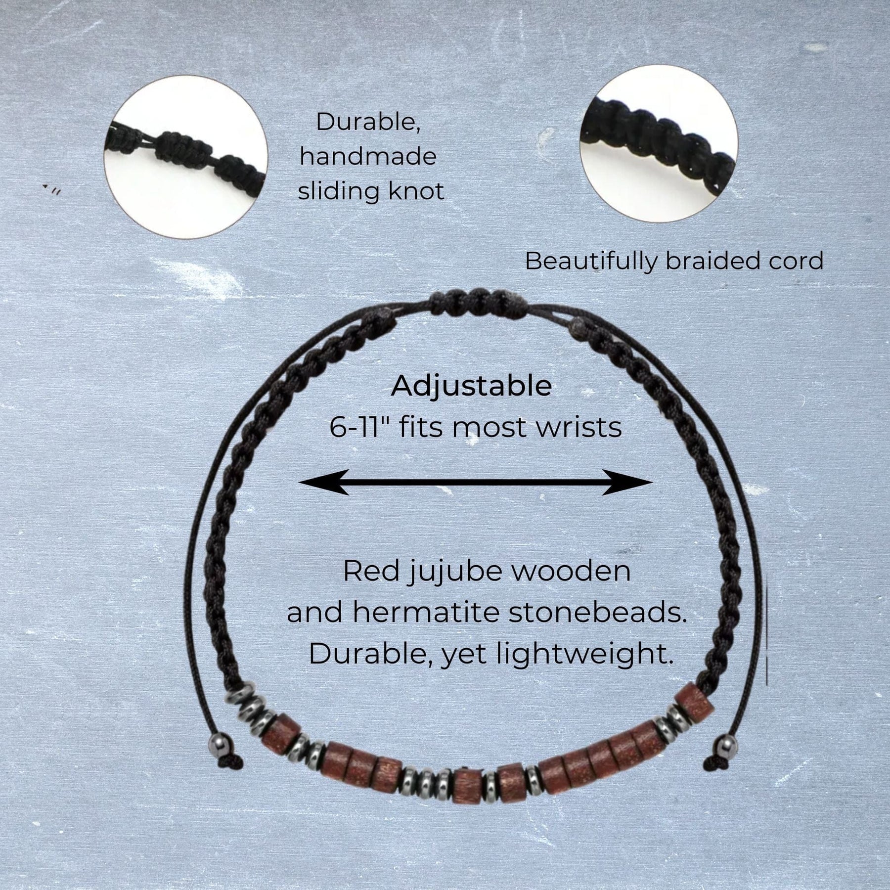 Handcrafted with precision, these bracelets feature a blend of jujube red wooden beads, hematite beads, and a robust braided cord. It's where durability meets chic, making for an accessory they won't want to take off.