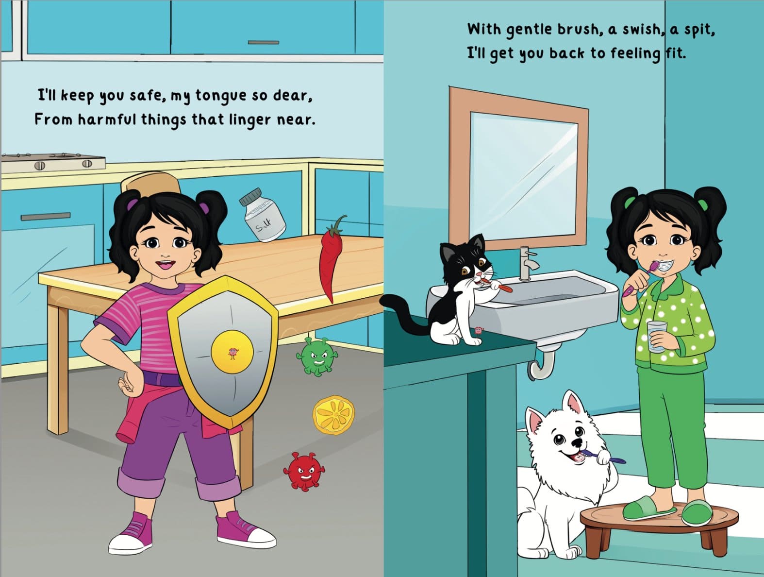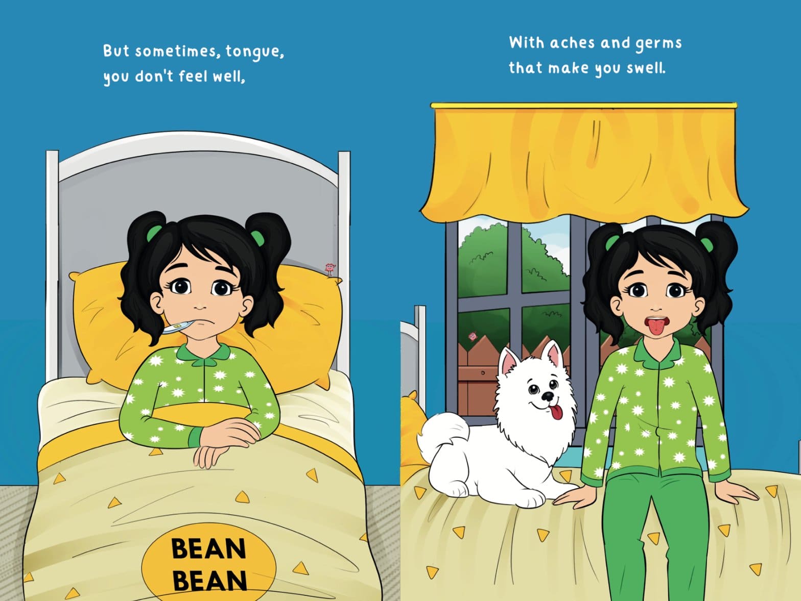 But it's not all giggles and tasty moments. When Bean-Bean's tongue feels sore or faces a challenge, she doesn't lose her sunny outlook. Instead, with Frosty the dog and Karma the cat by her side, Bean-Bean discovers the recipe for resilience: a dash of patience, a sprinkle of self-care, and a heaping helping of love.