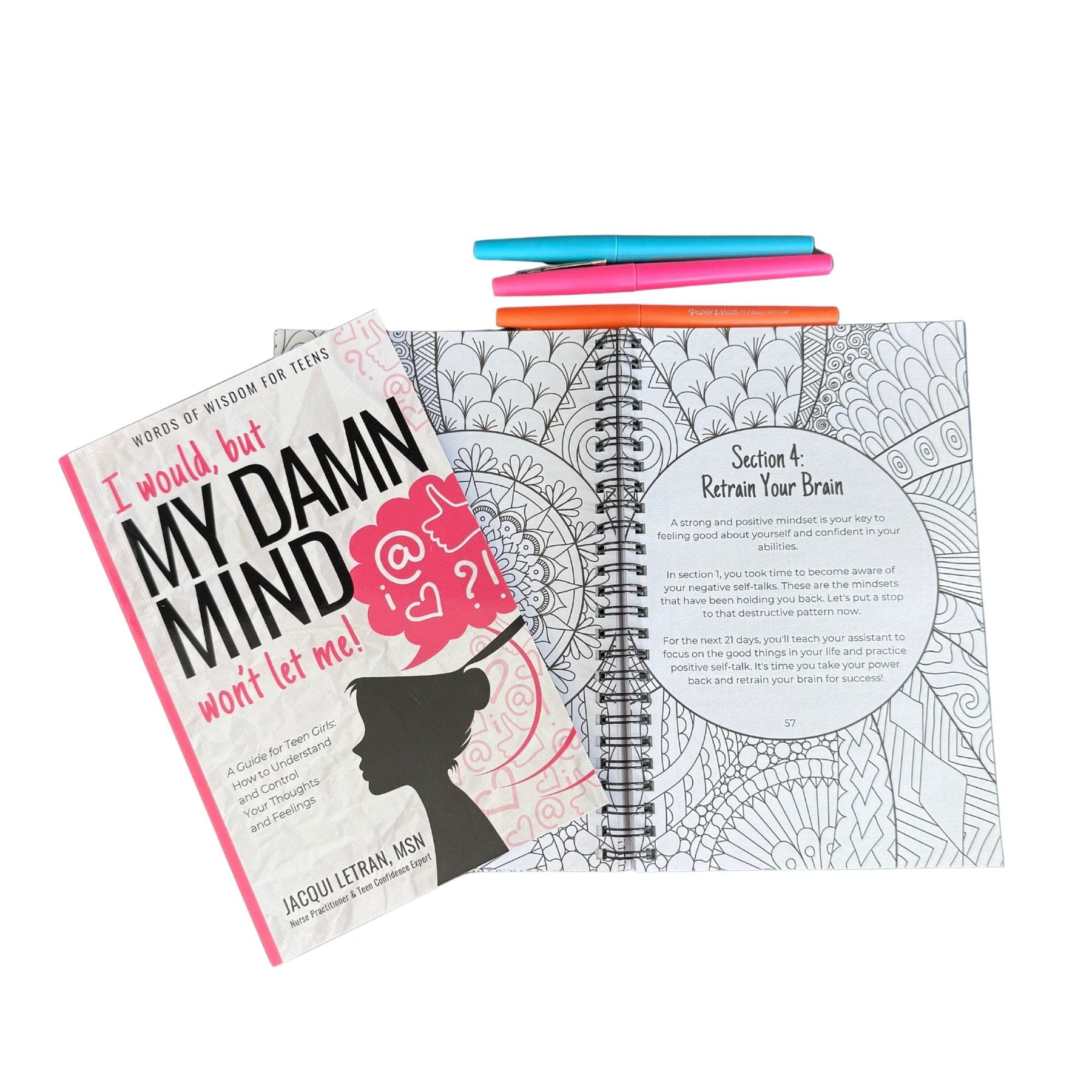 Teen Girls Damn Mind paperback book with colorful cover and spiral journal with pink and purple pages, Jacqui Letran branding